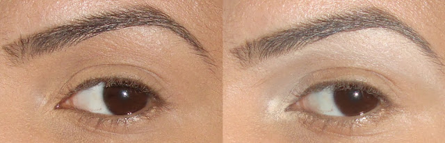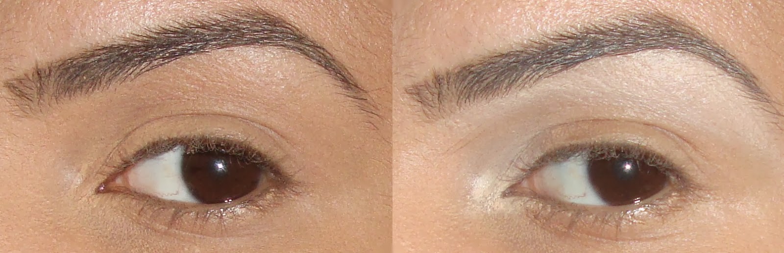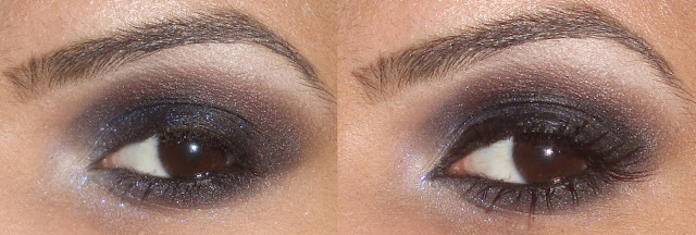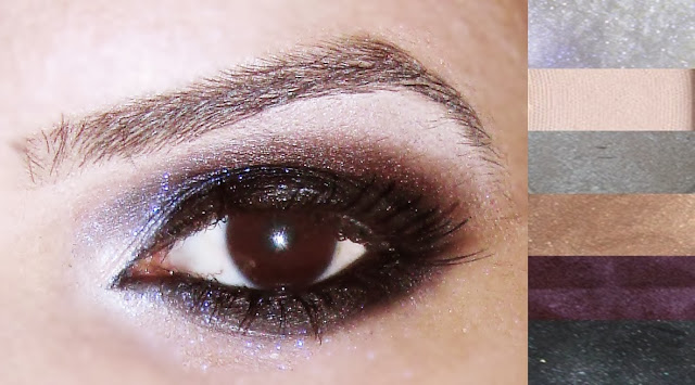 Com uma sombra cinza opaca, eu esfumei todo o olho, indo de encontro com a região da sobrancelha (notem que o esfumado já fica bem visível). Em seguida, apliquei uma sombra marrom opaca misturada com uma sombra vinho e novamente esfumei todo o olho, inclusive na região inferior.